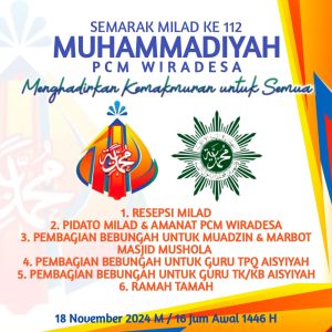 Pada 18 November 2024 Pimpinan Cabang Muhammadiyah Wiradesa Kab. Pekalongan menggelar Resepsi Milad Muhammadiyah ke 112 di Aula GDM Wiradesa yang dihadiri oleh seluruh unsur penggerak Muhammadiyah di Wiradesa, mulai Penasehat, Pimpinan Ranting Muhammadiyah, Majelis Lembaga, Ortom dan Amal Usaha Muhammadiyah Pimpinan Cabang Muhammadiyah se Cab. Wiradesa . Resepsi Milad ini bagian dari kegiatan Semarak Milad Muhammadiyah ke 112 Pimpinan Cabang Muhammadiyah Wiradesa.