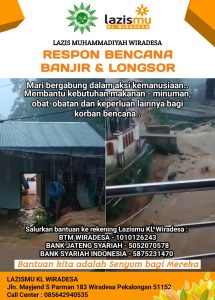 Ketua Lazismu KL Wiradesa H. Slamet Fahrudin menyampaikan terimakasih kepada para donatur ” Terimakasih Bapak Ibu atas infaqnya untuk bencana banjir dan longsor ini, penggalangan masih terus dibuka untuk wilayah-wilayah bencana lainnya”